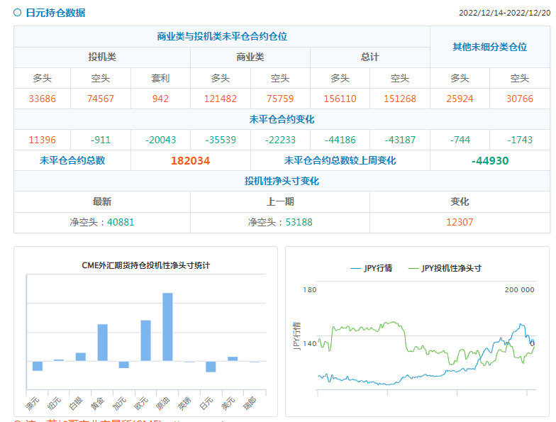 12月20日当周,日元净空头头寸为40881手合约,英镑净空头头寸减少5603手,欧元净多头头寸为142272手;瑞士法郎净空头头寸为4064手。