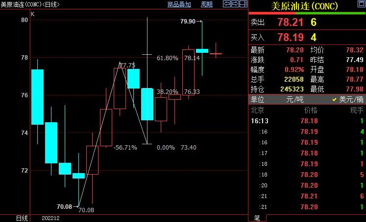 北京时间16:14,NYMEX原油期货上涨0.94%至78.23美元/桶;ICE