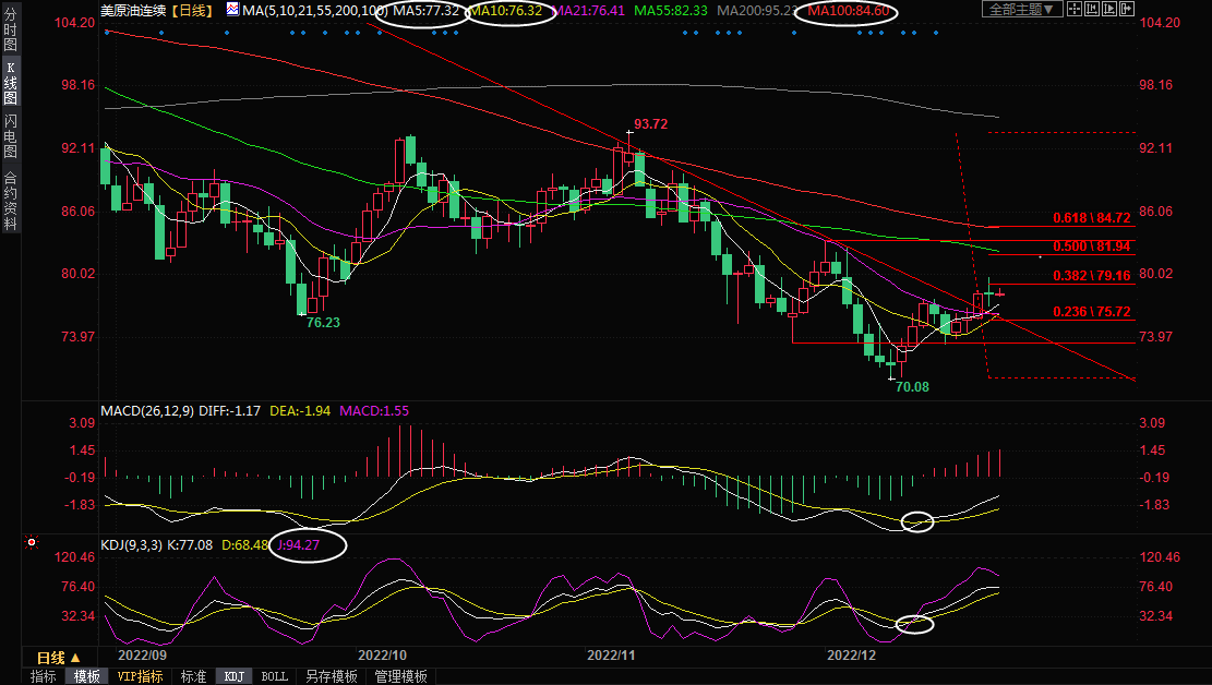 由于KDJ的J值以及发出了超买信号,在顶破80整数关口前,仍需提防油价重回跌势的可能性,下方5日均线支撑在77.32附近,10日均线支撑在76.32附近,需要重点关注。周二低点支撑在74.44附近,12月16日低点支撑在73.31附近。