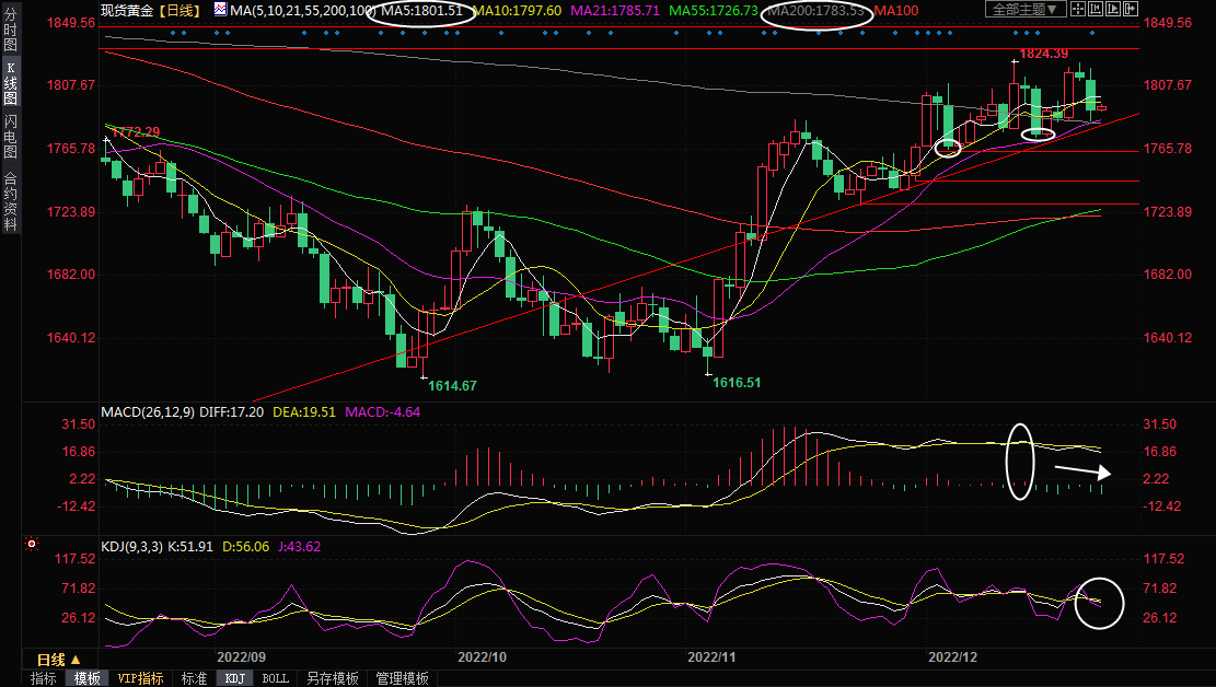 周四出炉的初请数据和三季度GDP终值好于预期,金价再度跌至1800关口下方,短线看空信号再度增强,留意200日均线1783.53附近支撑,短线上涨趋势线支撑也在该位置附近,如果失守该支撑,则增加中线看空信号。