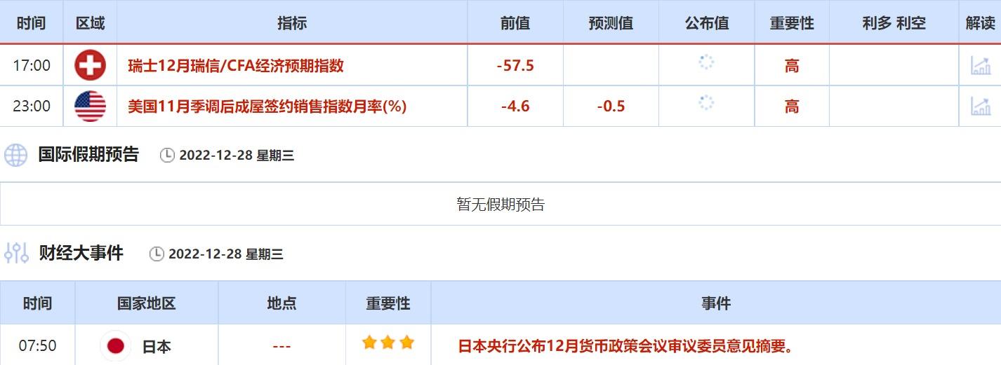 12月27日,中国香港交易所因圣诞节,休市一日;澳大利亚悉尼证券交易所和英国伦敦证券交易所,因圣诞节补休,休市一日。③12月28日(周三)关键字:美国11月季调后成屋签约销售指数,日银货币政策会议审议委员意见摘要