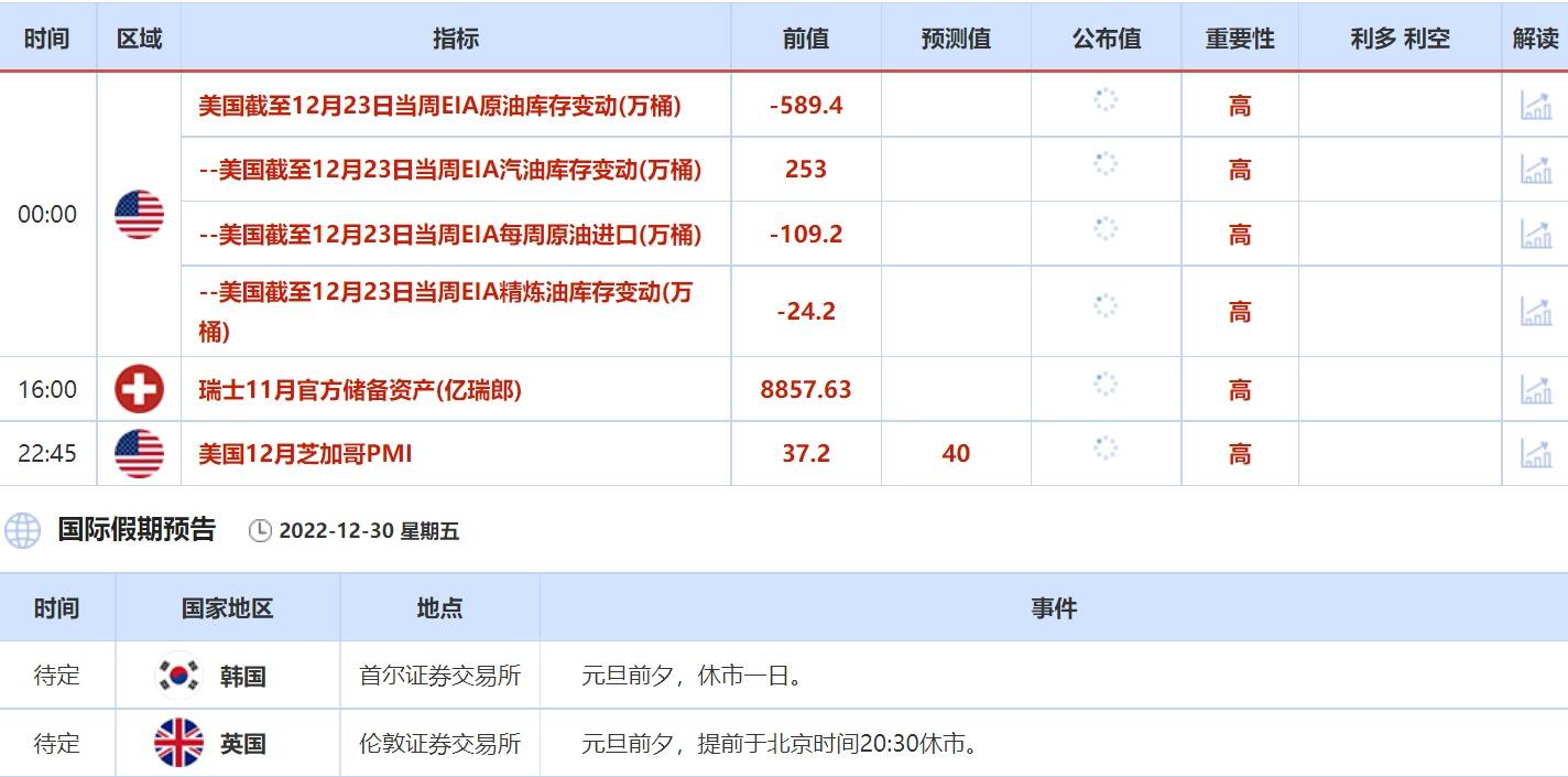 12月30日,韩国首尔证券交易所因元旦前夕,休市一日;英国伦敦证券交易所,因元旦前夕,提前于北京时间20:30休市。除了以上数据和大事件,投资者还需关注全球疫情的发展,亚洲经重启经济的状况,以及乌克兰局势的发展,料也对金融市场造成一定影响。
