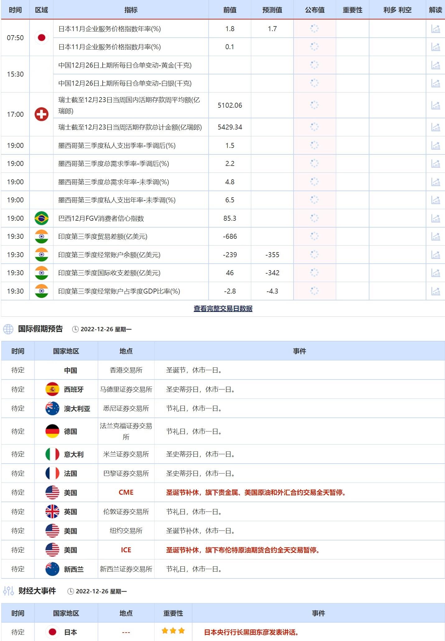 07:50 日本11月企业服务价格指数年率(%) , 前值 1.8 , 预期值 1.7 , 公布值:待发布07:50 日本11月企业服务价格指数月率(%) , 前值 0.1 , 预期值 -- , 公布值:待发布15:30 中国12月26日上期所每日仓单变动-黄金(千克) , 前值 需加前值 , 预期值 -- , 公布值:待发布
