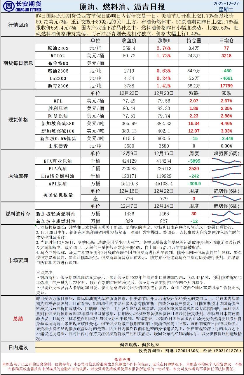 12月27日,长安期货发布原油早评,认为原油将偏强震荡,建议偏多短差。