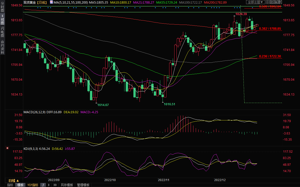 现货黄金震荡微涨,一度创两个交易日高点至1804.78美元附近,中国周一晚间发文明确,自2023年1月8日起,将新型冠状病毒肺炎更名为新型冠状病毒感染,取消入境后集中隔离、有序恢复出境游。这令市场风险偏好有所改善,打压了美元的避险需求,美元跌创三个交易日新低,给金价提供支撑,俄乌地缘局势持续也给金价提供支撑;调查显示,投资者偏向认为2023年金价有望迎来上涨。
