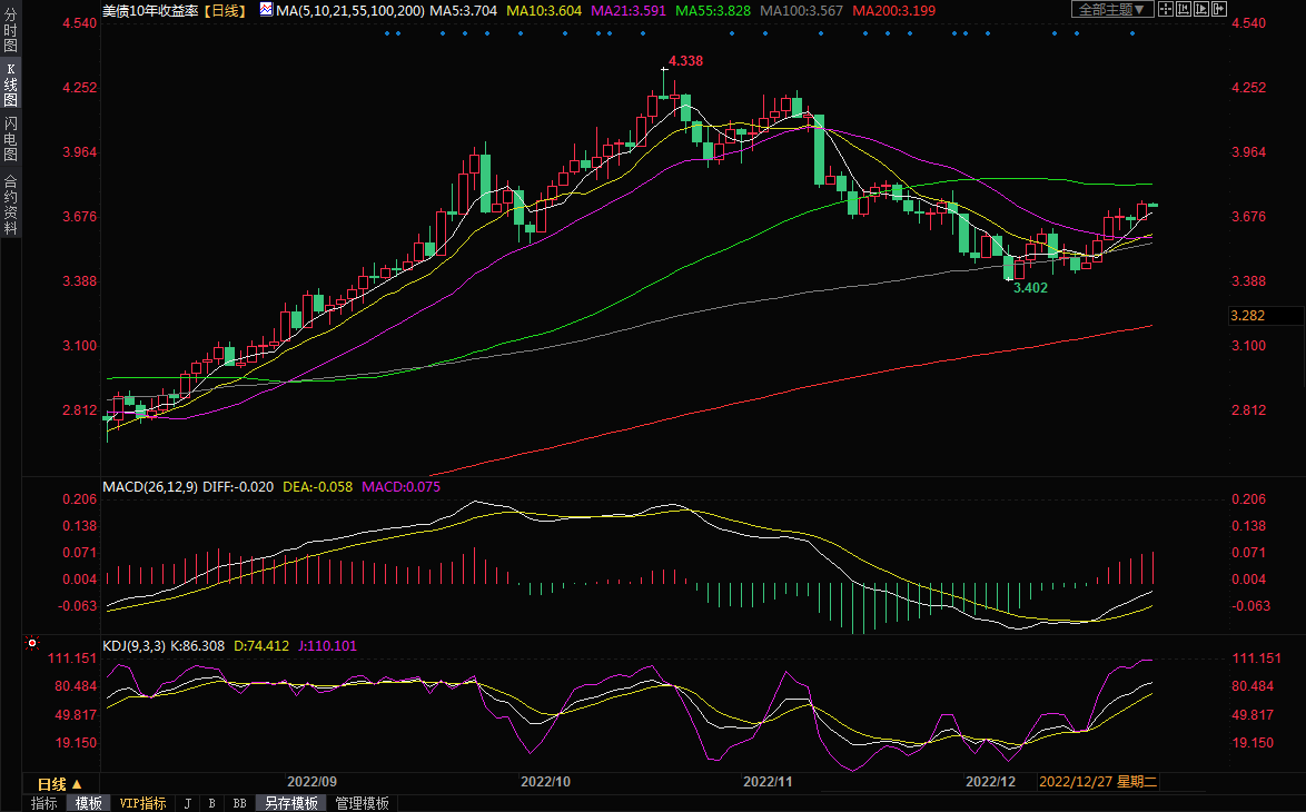 10年期美债收益率上周五上涨9个基点,至3.749%,盘中一度创12月1日以来新高至3.753%,两年期美债收益率上周五上涨7个基点,至4.330%。