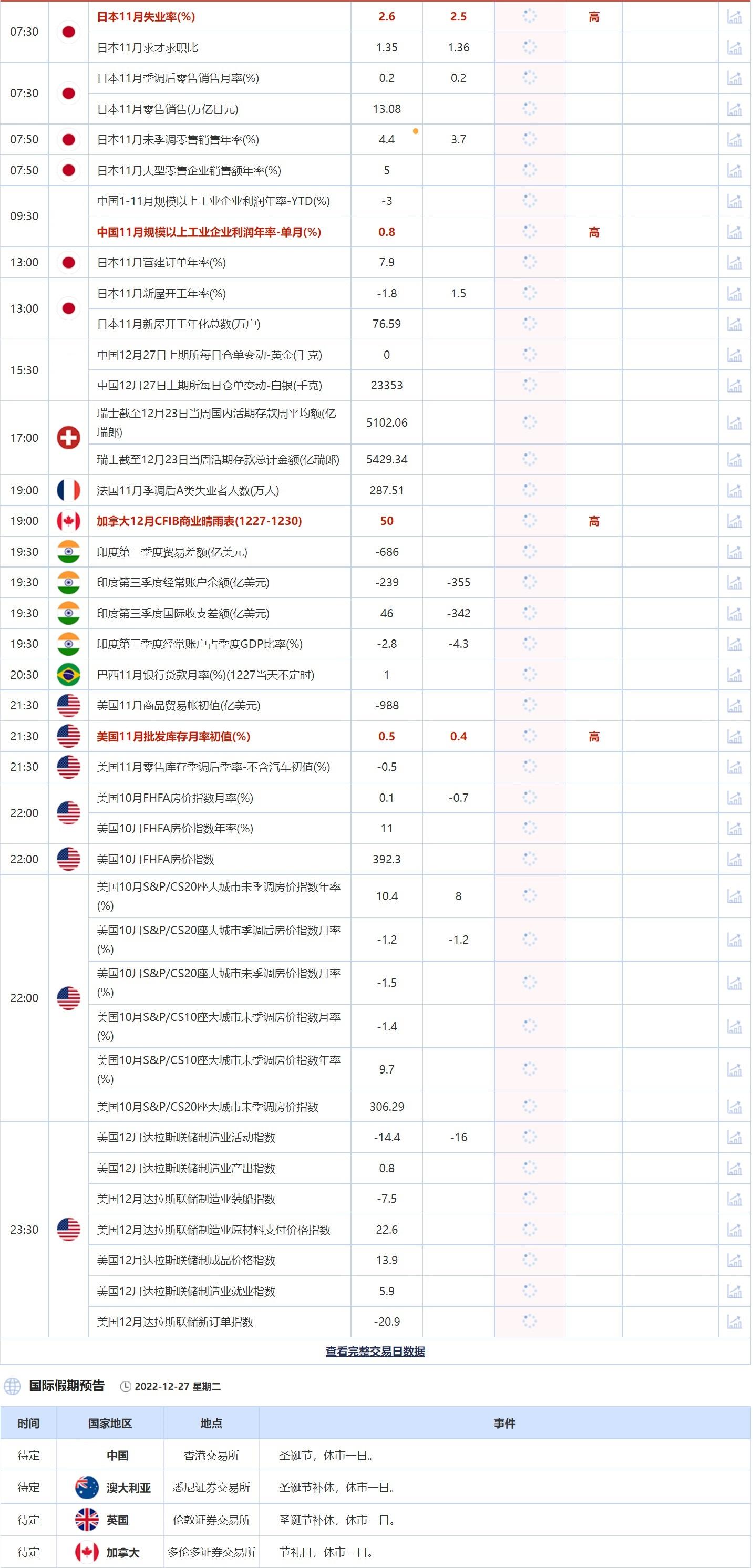 汇通财经APP讯——12月27日,投资者需关注的重点数据:日本11月失业率,日本11月季调后零售销售月率,日本11月未季调零售销售年率,中国11月规模以上工业企业利润年率-单月,日本11月营建订单年率,加拿大12月CFIB商业晴雨表和美国11月批发库存月率初值。当天需关注中国香港交易所,澳大利亚悉尼证券交易所,英国伦敦证券交易所和加拿大多伦多证券交易所的休市公告。