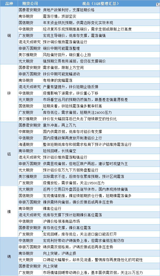 标题:期货公司观点汇总一张图:12月28日有色系(铜、锌、铝、镍、锡等)