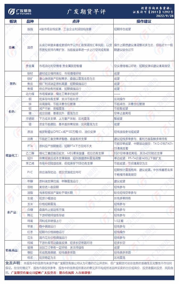 广发期货发布9月28日早评,认为贵金属空头情绪难以好转,短期反弹后建议逢高做空,锌节前减仓,注意仓位管理,原油短线波段参与或观望,生猪长线多单持有。