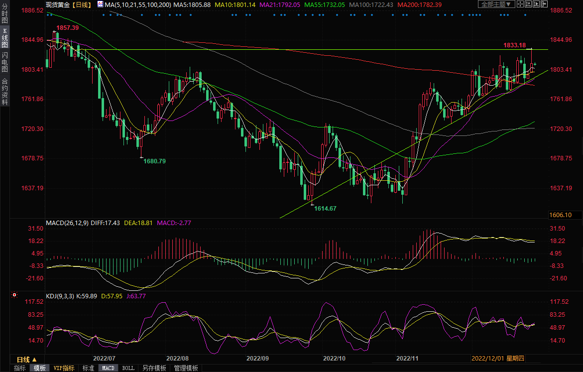 现货黄金窄幅震荡,目前交投于1810.84美元/盎司附近,基本面相对清淡,中国防控新冠限制决定的乐观情绪令美元承压,金价周二一度创近半年新高至1833.18美元/盎司,但美国国债收益率攀升限制涨幅。