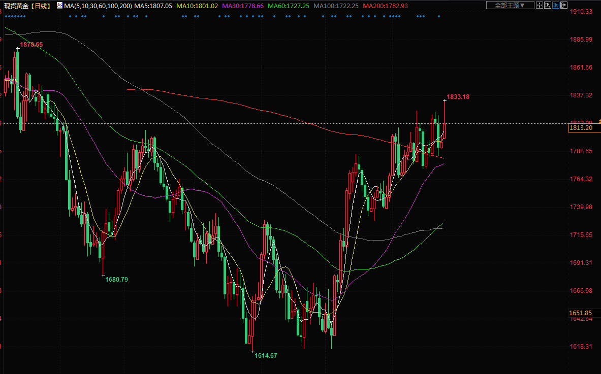 金价周二跳升至六个月来最高,因乐观情绪令美元承压,但美国指标国债收益率攀升限制涨幅。现货金跳涨1.1%,至每盎司1816.69美元,盘中稍早触及1832.99美元的6月27日以来最高。
