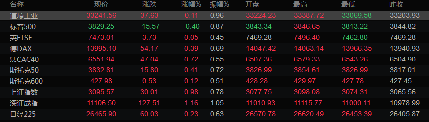 美股收盘情况:道琼斯指数收盘上涨0.11%,报33241.63点;