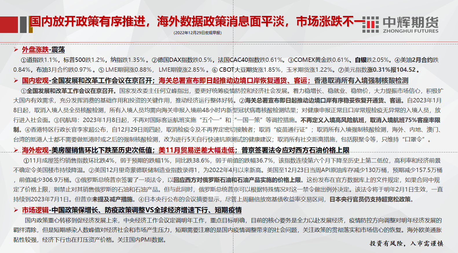 12月29日,中辉期货发布宏观早报,称海外欧美通胀黏性较强,经济下行迹象对资产价格产生压力,本周关注国内PMI数据。
