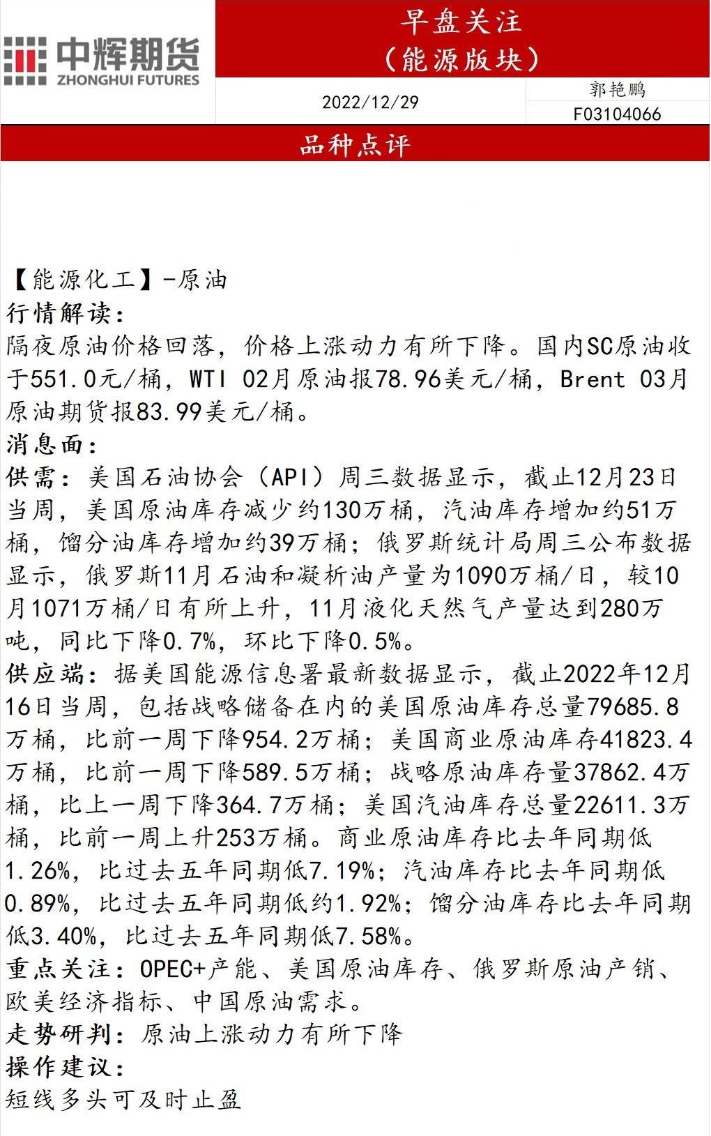 12月29日,中辉期货发布能源早盘关注,称原油上涨动力有所下降,建议短线多头可及时止盈。