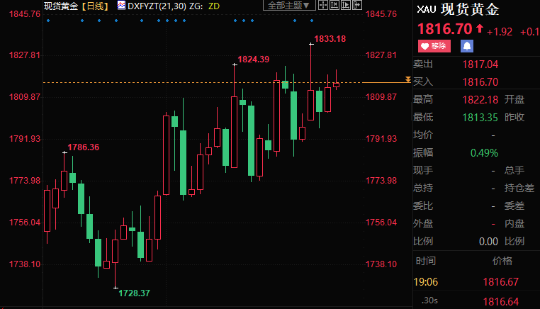 现货黄金周线上涨1.07%至1816.82美元/盎司;COMEX期金主力合约周线上涨0.96%至1823.3美元/盎司;