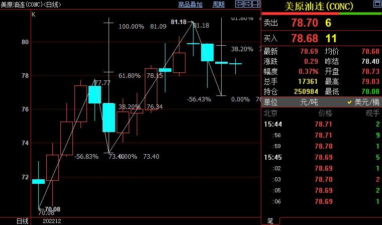 北京时间15:45,NYMEX原油期货上涨0.31%至78.64美元/桶;ICE