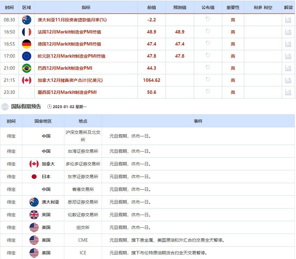 ①1月2日(周一)关键字:欧元区12月Markit制造业PMI终值,元旦休市公告