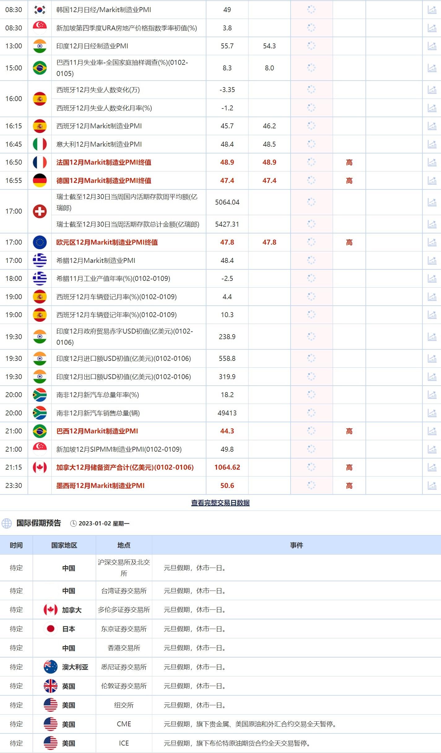 16:50 法国12月Markit制造业PMI终值 , 前值 48.9 , 预期值 48.9 , 公布值:待发布16:55 德国12月Markit制造业PMI终值 , 前值 47.4 , 预期值 47.4 , 公布值:待发布17:00 瑞士截至12月30日当周国内活期存款周平均额(亿瑞郎) , 前值 5064.04 , 预期值 -- , 公布值:待发布