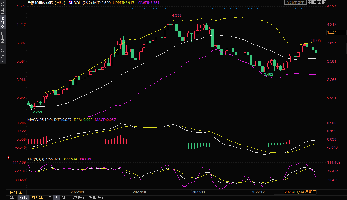 但10年期国债收益率周二下跌3.9个基点,收报3.792%,为连续三个交易日下跌,周三延续跌势,目前交投于3.728%附近,为近一周新低,从技术面来看,受到布林线上轨阻力后,短线偏向试探布林线中轨3.639%附近支撑。