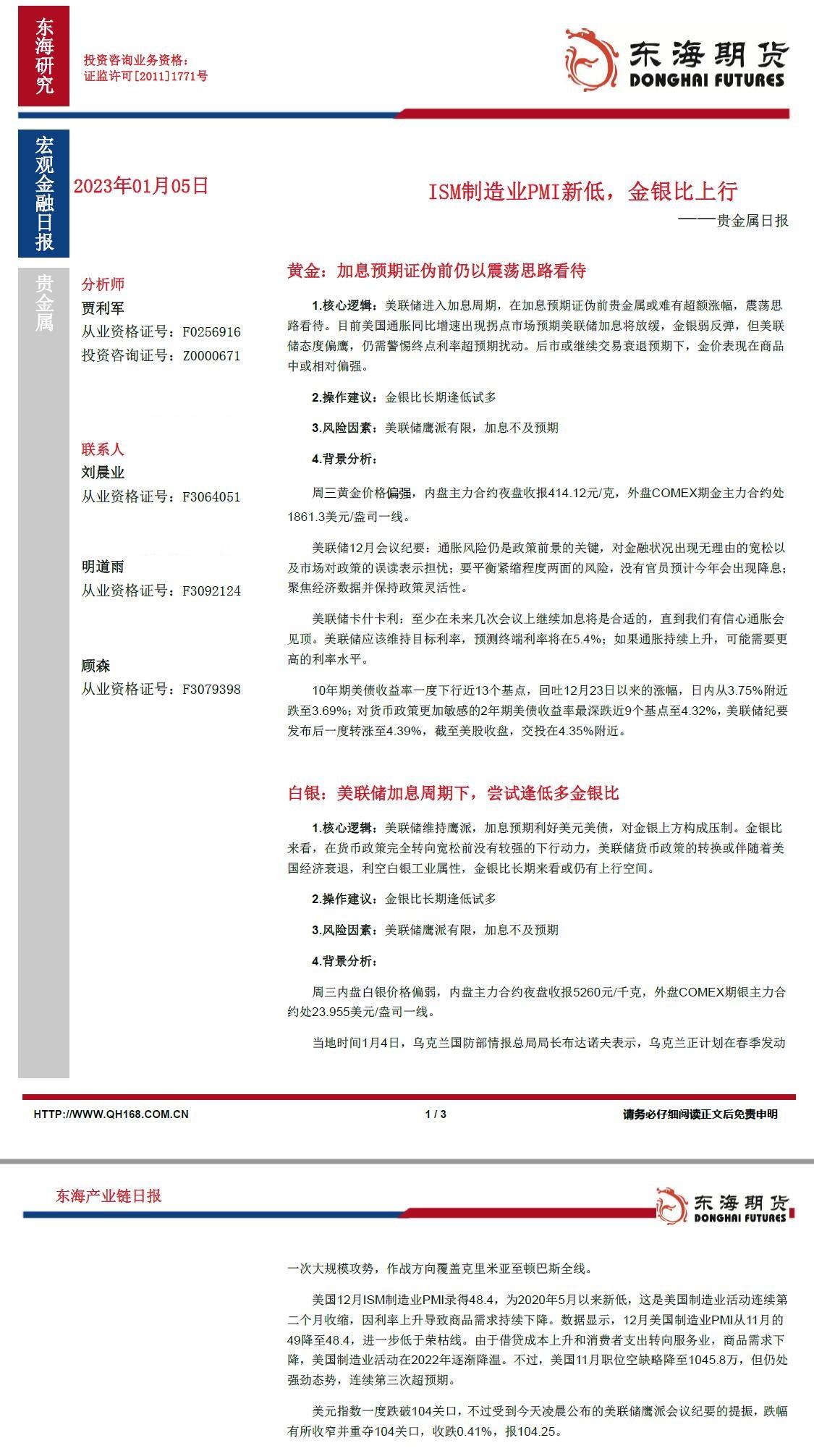 标题:【东海期货1月5日产业链日报】贵金属篇:ISM制造业PMI新低,金银比上行