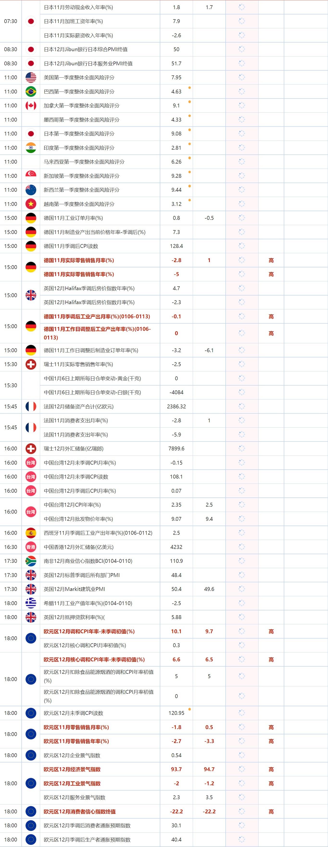 18:00 欧元区12月调和CPI年率-未季调初值(%) , 前值 10.1 , 预期值 9.7 , 公布值:待发布18:00 欧元区12月核心调和CPI月率初值(%) , 前值 0.3 , 预期值 -- , 公布值:待发布