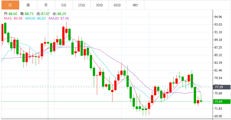 商品收盘情况:布伦特原油期货下跌0.2%,报收于每桶78.57美元,而美国原油上涨0.1%,报收于73.77美元。美国期金结算价报1869.7美元,上涨1.6%。