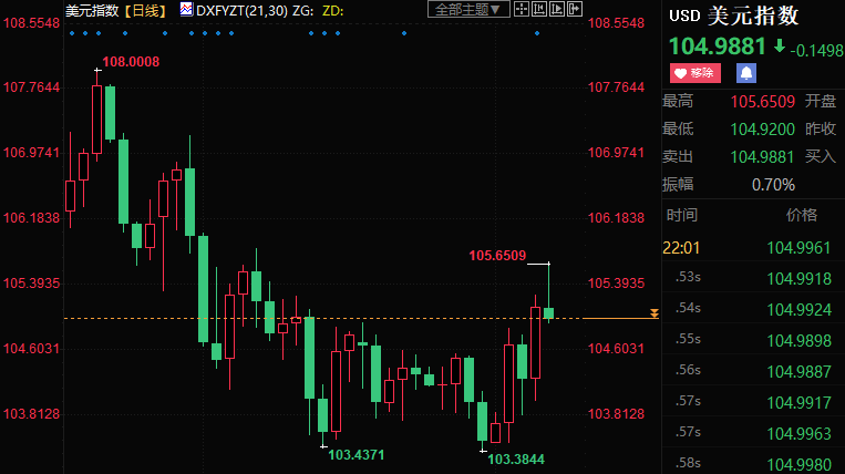 美元指数周线上涨1.41%至104.955。
