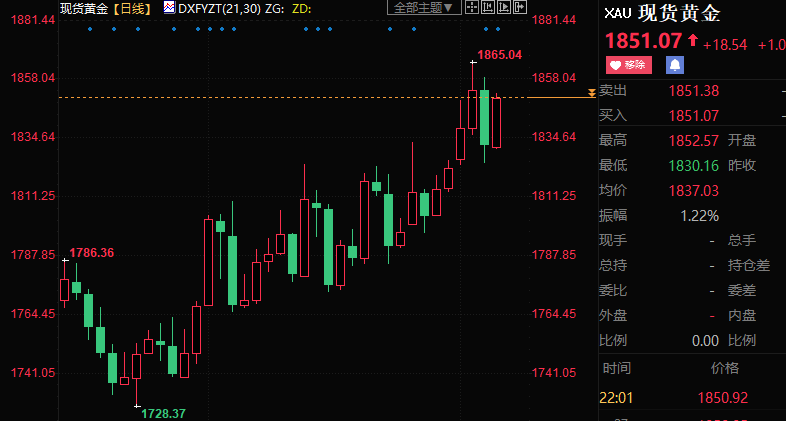 现货黄金周线上涨1.50%至1850.40美元/盎司;