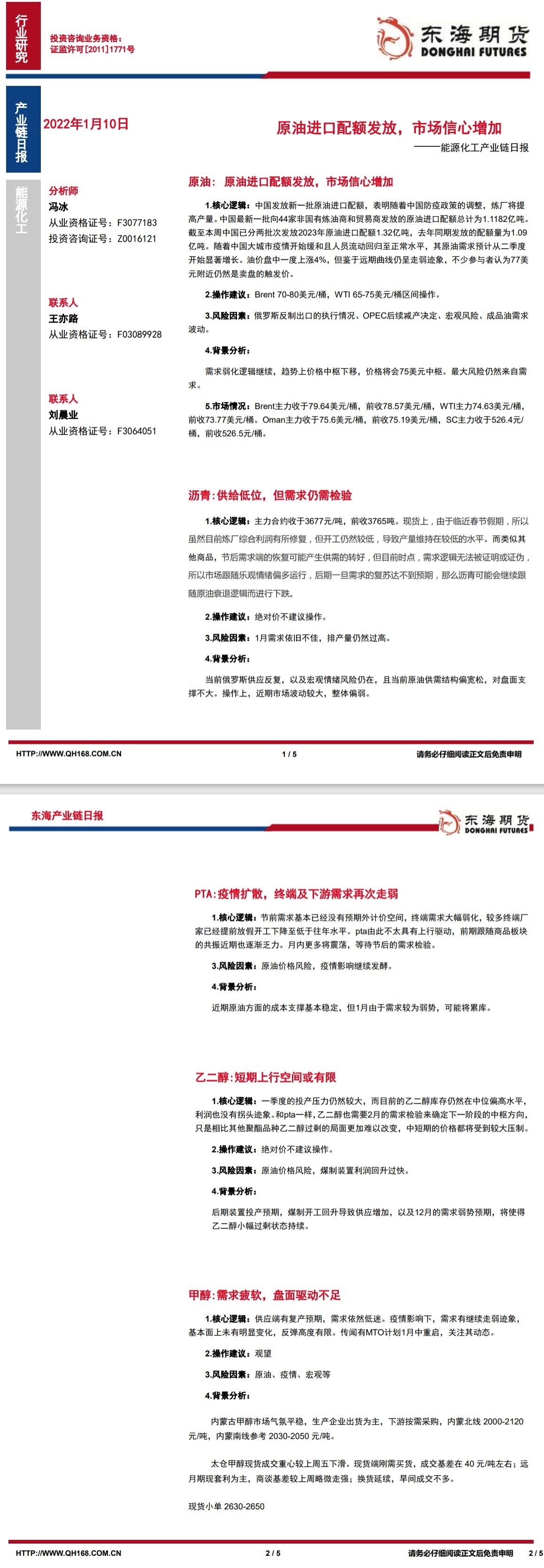 标题:【东海期货1月10日产业链日报】能化篇:原油进口配额发放,市场信心增加