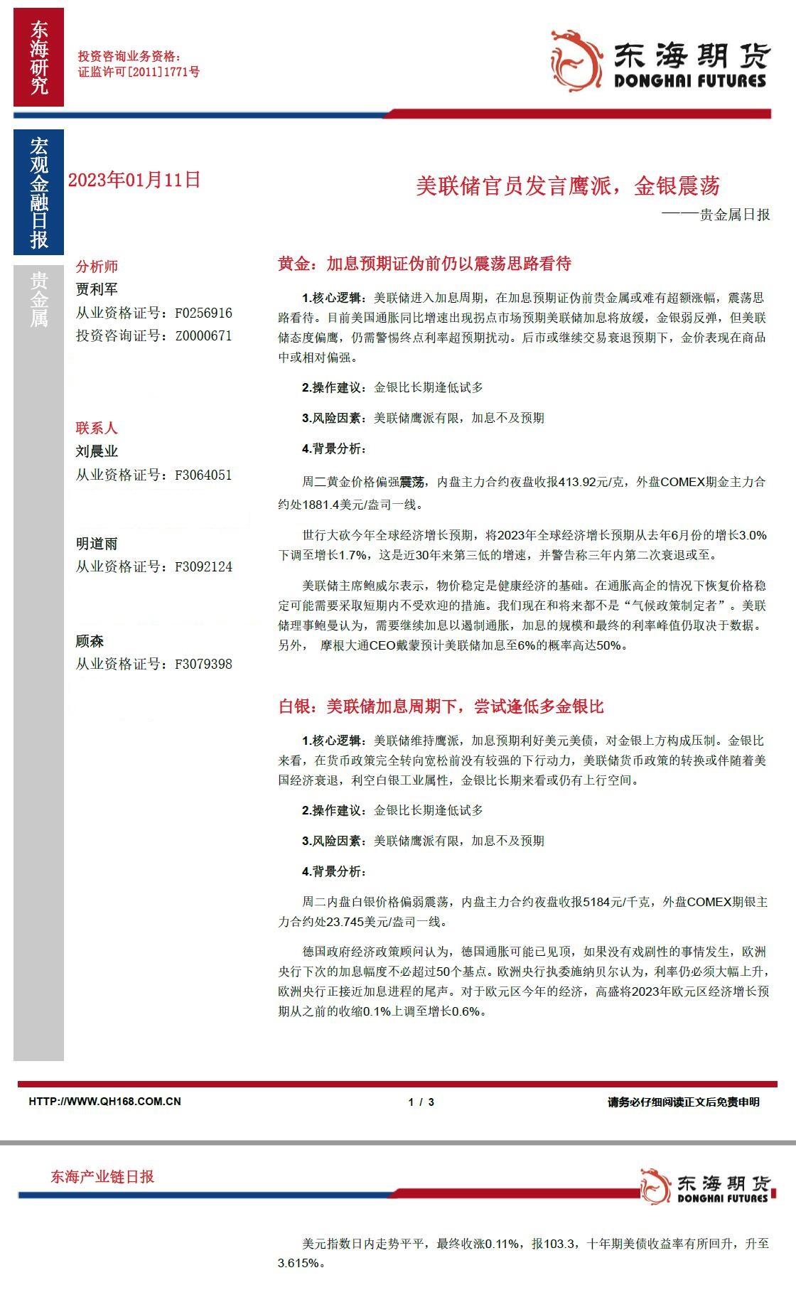 标题:【东海期货1月11日产业链日报】贵金属篇:美联储官员发言鹰派,金银震荡