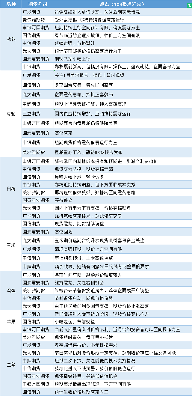 标题:期货公司观点汇总一张图:1月11日农产品(棉花、豆粕、白糖、玉米、鸡蛋、生猪等)