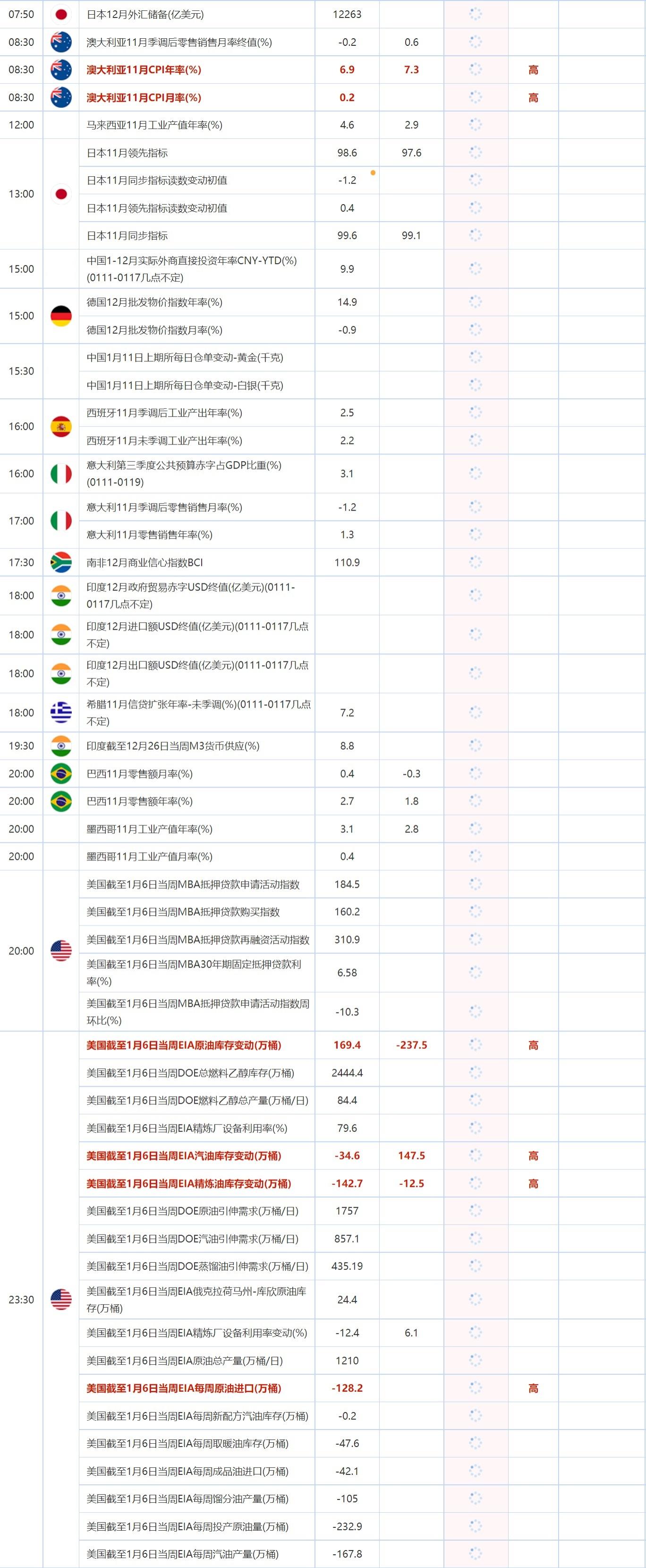 23:30 美国截至1月6日当周EIA原油库存变动(万桶) , 前值 169.4 , 预期值 -237.5 , 公布值:待发布23:30 美国截至1月6日当周DOE总燃料乙醇库存(万桶) , 前值 2444.4 , 预期值 -- , 公布值:待发布