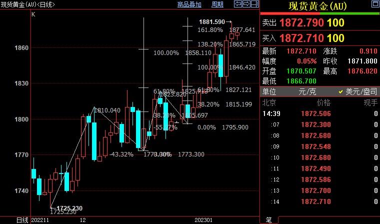 现货黄金上涨0.18%至1874.64美元/盎司;COMEX期金主力合约上涨0.07%至1879.2美元/盎司;