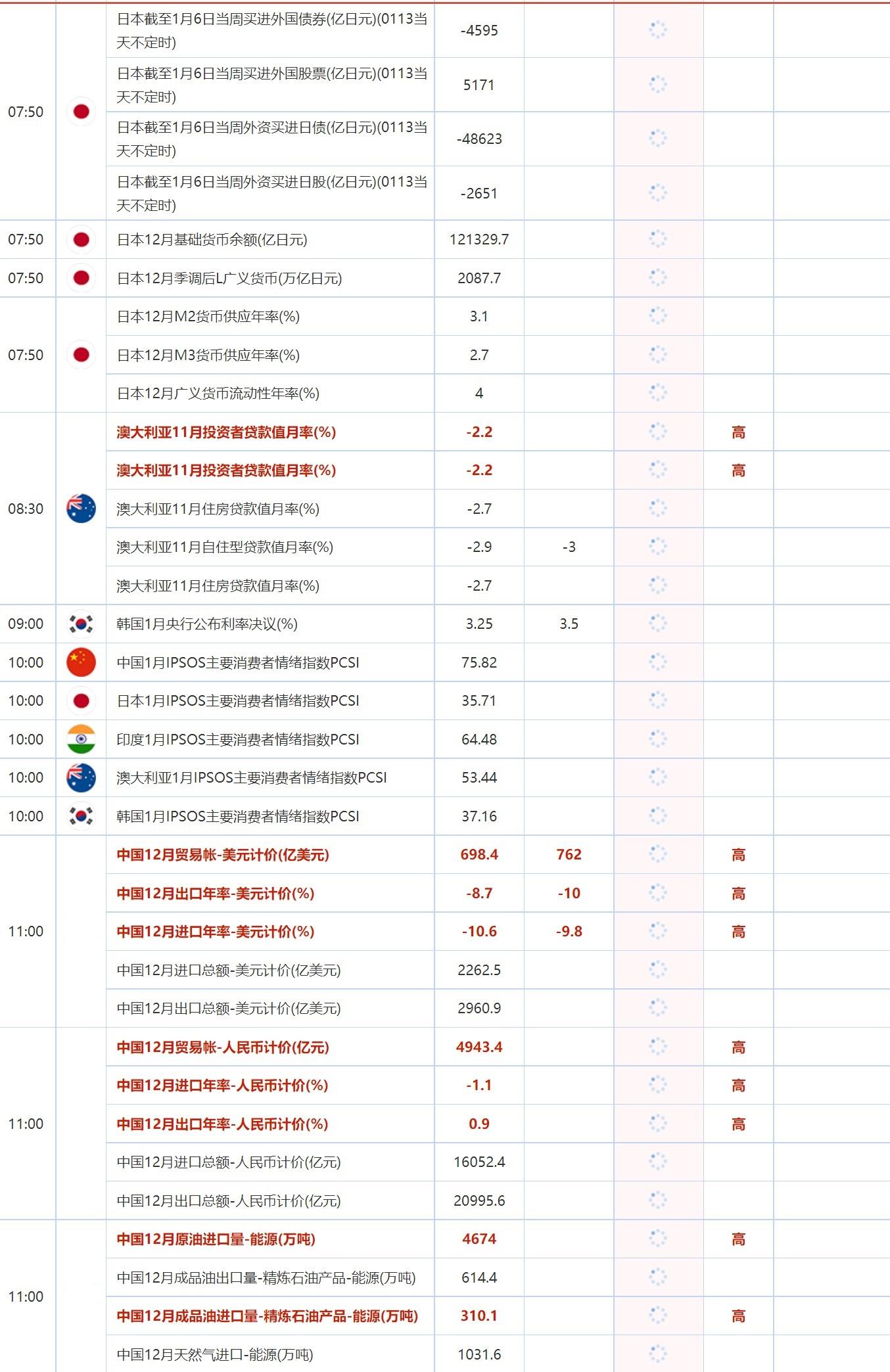11:00 中国12月贸易帐-人民币计价(亿元) , 前值 4943.4 , 预期值 -- , 公布值:待发布11:00 中国12月进口年率-人民币计价(%) , 前值 -1.1 , 预期值 -- , 公布值:待发布