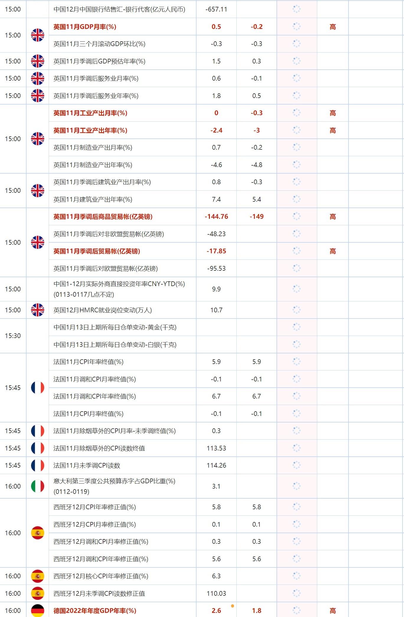 16:00 德国2022年年度GDP年率(%) , 前值 2.6 , 预期值 1.8 , 公布值:待发布17:00 意大利11月季调后工业产出月率(%) , 前值 -1 , 预期值 0.3 , 公布值:待发布