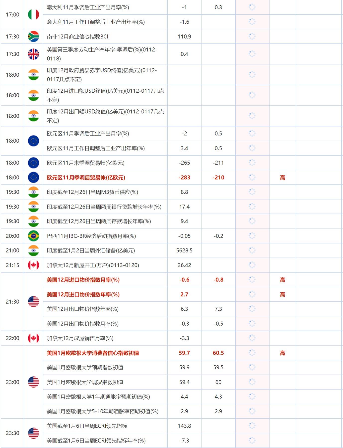 23:00 美国1月密歇根大学消费者信心指数初值 , 前值 59.7 , 预期值 60.5 , 公布值:待发布23:00 美国1月密歇根大学预期指数初值 , 前值 59.9 , 预期值 59.5 , 公布值:待发布