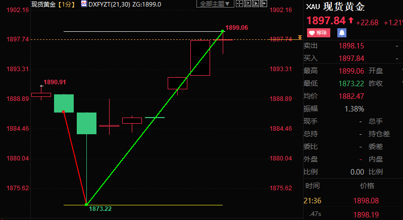 现货黄金跳水近14美元至1873.22美元/盎司后反弹超25美元至1899.06美元/盎司。