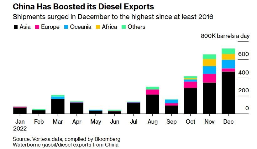 中国增加了柴油出口——12月出货量飙升至至少2016年以来的最高水平