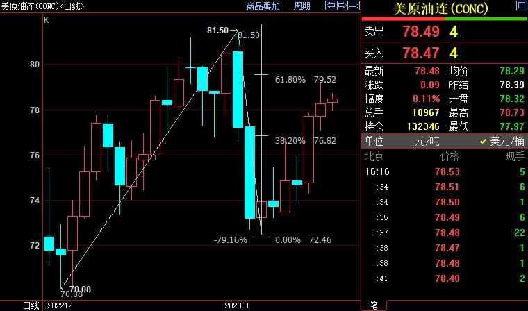 北京时间16:17,NYMEX原油期货上涨0.13%至78.49美元/桶;ICE