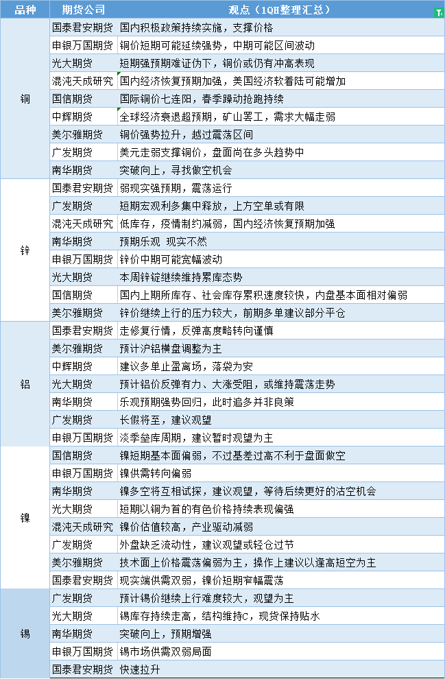 期货公司观点汇总一张图:1月16日有色系(铜、锌、铝、镍、锡等)
