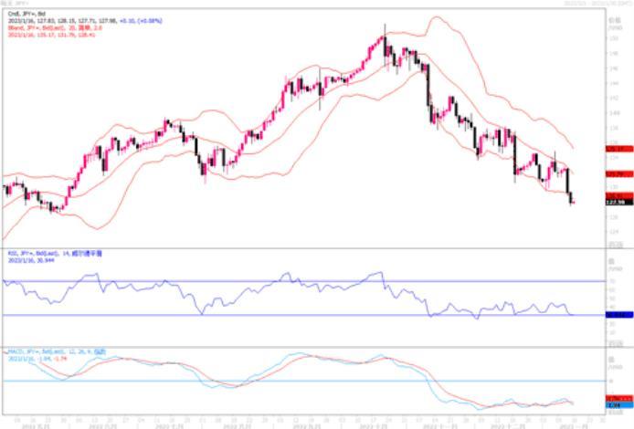 美元兑日元盘中最低跌至127.46,收盘在127.85,全日下跌1.07%。虽然日本央行仍坚持刺激政策,而全球大多数央行早就开始加息。但有迹象表明,通胀更具粘性以及大体停滞不前的薪资可能上涨,这使一些投资者相信,最早可能在下周调整收益率曲线控制政策,甚至取消。虽然下周加息似乎不太可能,但日本央行有可能在那时放弃收益率曲线控制,以便为在3月或4月会议上升息做准备。巴克莱外汇分析师在给客户的一份报告中表示:“我们估计日本央行进一步调整政策的影响可能推动日圆升值,幅度最高可达2.7%,但我们认为风险在于市场会作出更大的反应--升值幅度可能翻倍。” 日线图上,