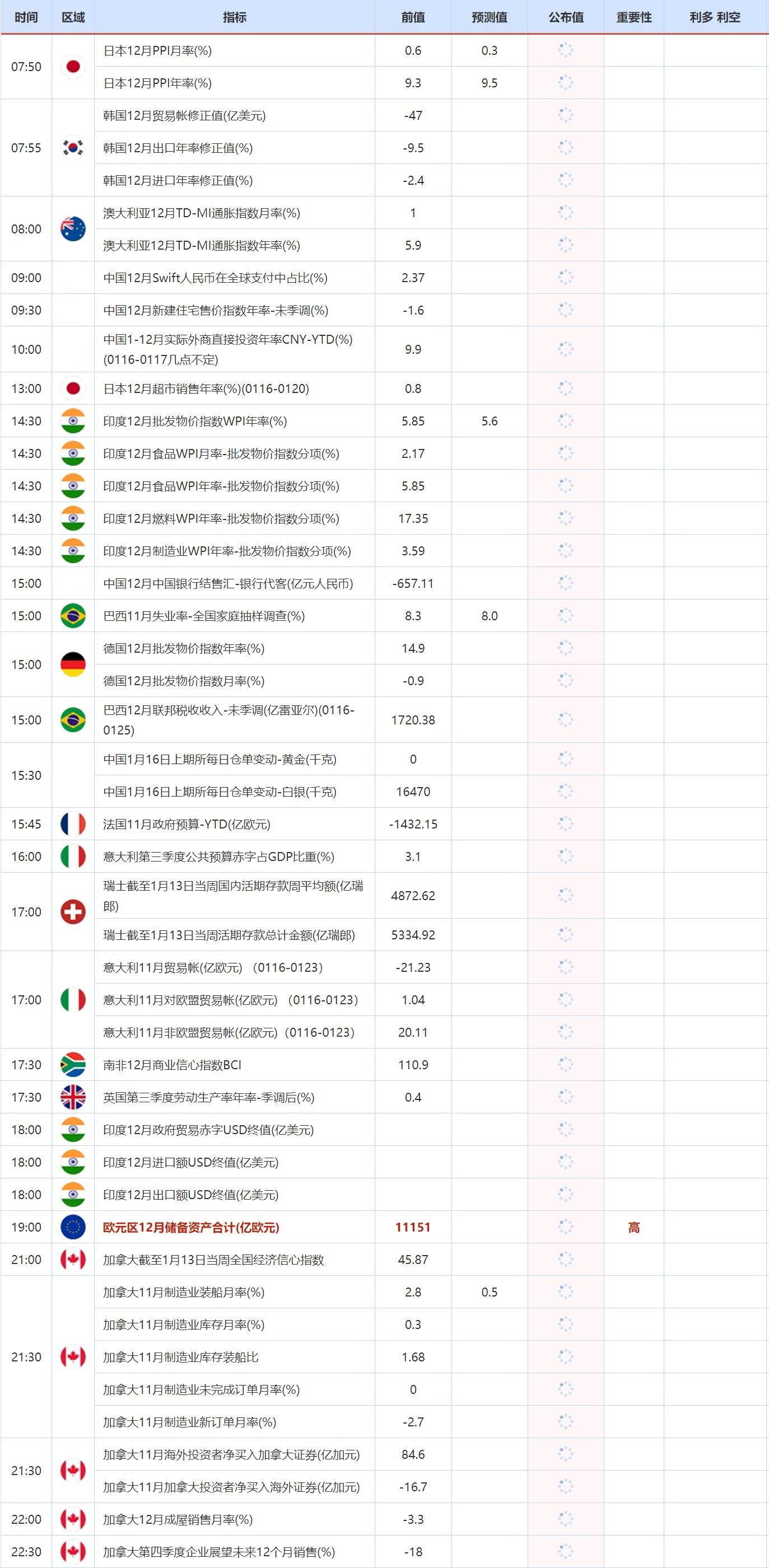 19:00 欧元区12月储备资产合计(亿欧元) , 前值 11151 , 预期值 -- , 公布值:待发布21:00 加拿大截至1月13日当周全国经济信心指数 , 前值 45.87 , 预期值 -- , 公布值:待发布21:30 加拿大11月制造业装船月率(%) , 前值 2.8 , 预期值 0.5 , 公布值:待发布