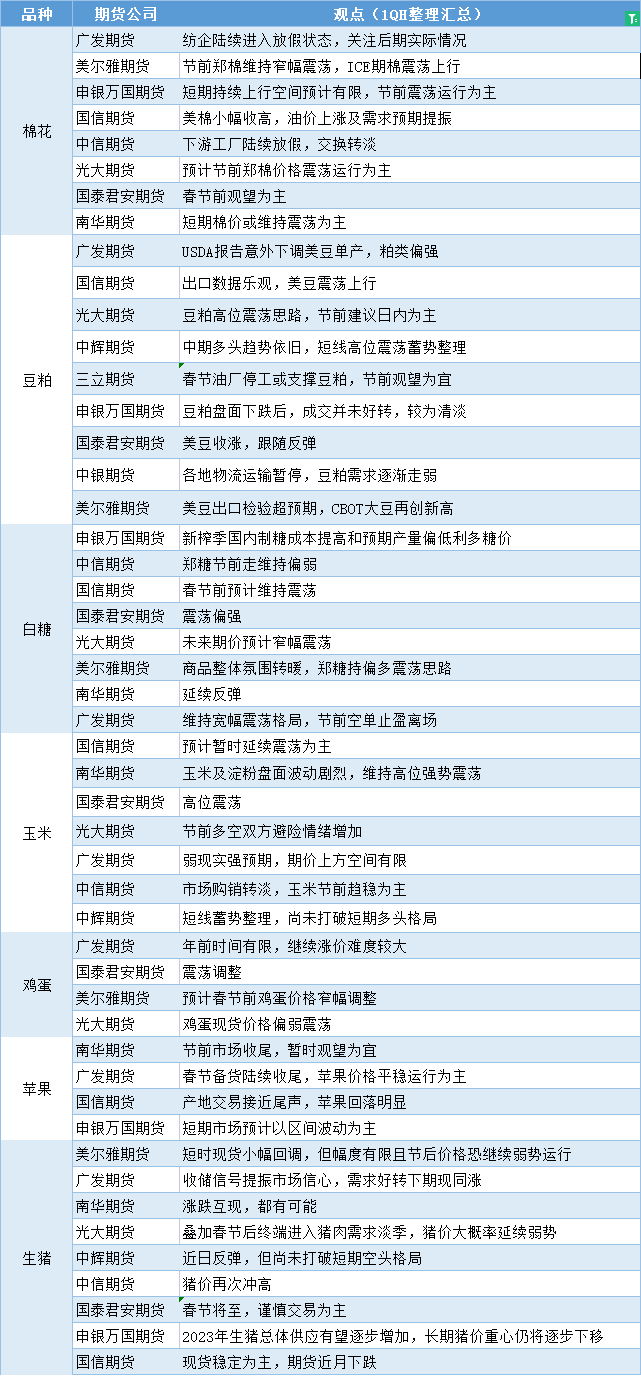 标题:期货公司观点汇总一张图:1月18日农产品(棉花、豆粕、白糖、玉米、鸡蛋、生猪等)
