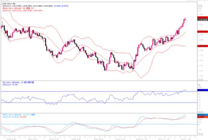 技术层面上,日线级别:单边上涨;MACD金叉,KDJ金叉,均线接近多头排列,55日均线接近上穿200日均线,多头仍占据上风。上年4月25日高点阻力在1934.45附近,4月20日高点阻力在1958.23附近。由于1920上方在2022年3月份是一个密集成交区,1920关口也是一个重要位置,金价短线涨幅也比较大,在收盘于1920关口上方前,金价短线也面临高位震荡调整甚至是短线见顶风险的风险,下方初步支撑参考1910关口,这是上周五纽约时段低点支撑所在,然后是1900整数关口, 10日均线支撑在1875.05附近,在失守该位置前,金价后市仍留有进一步冲高机会。