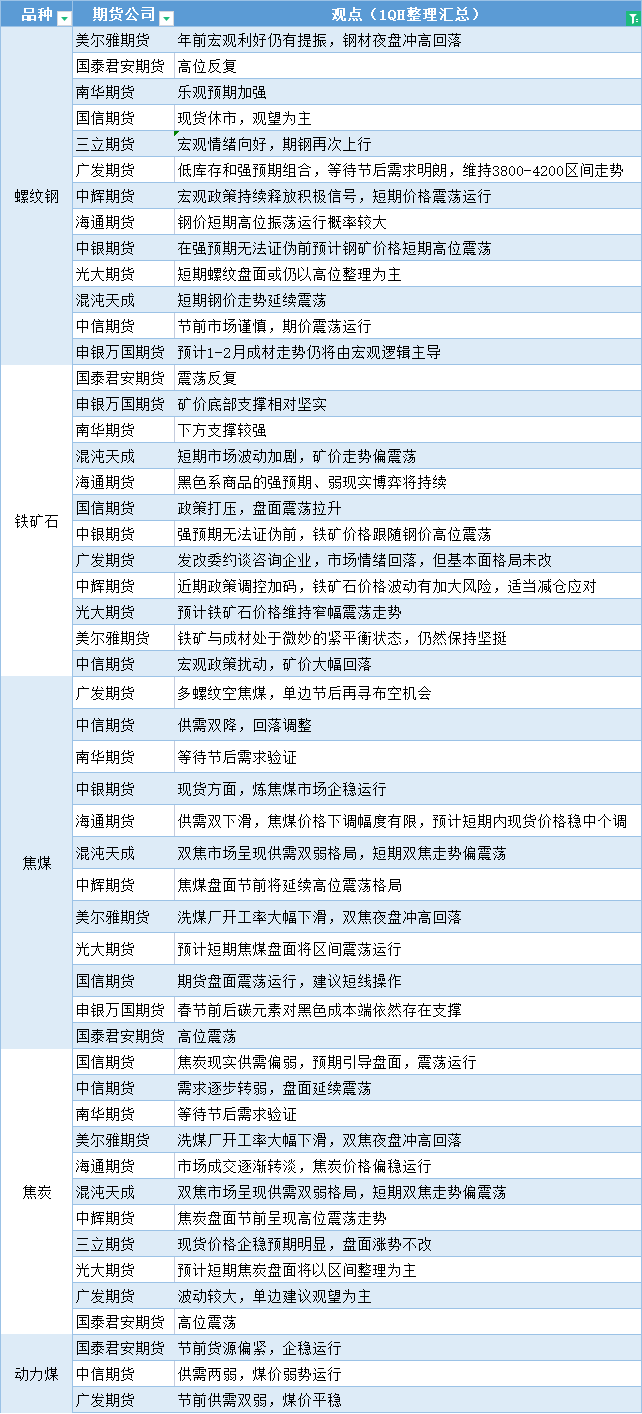 标题:期货公司观点汇总一张图:1月19日黑色系(螺纹钢、焦煤、焦炭、铁矿石、动力煤等)