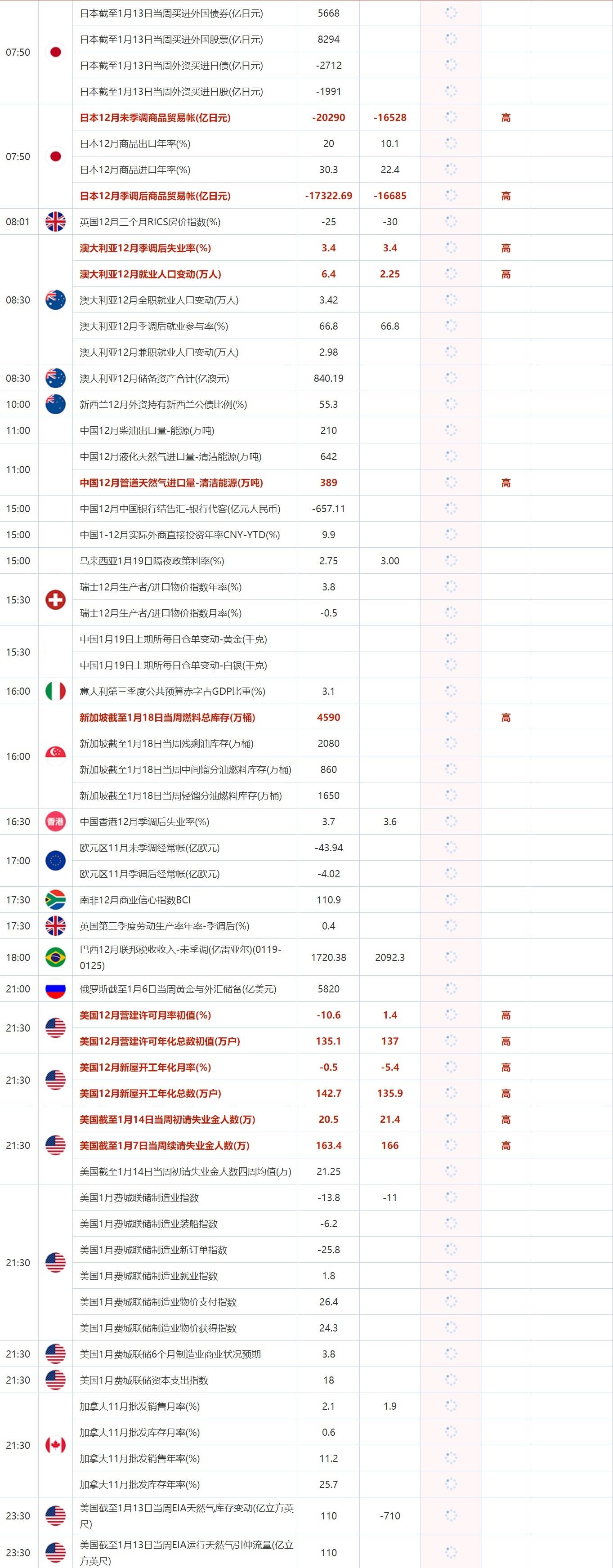 汇通财经APP讯——1月19日,投资者需要关注的重点数据:日本12月未季调商品贸易帐,澳大利亚12月季调后失业率,澳大利亚12月就业人口变动,新加坡截至1月18日当周燃料总库存,美国12月营建许可月率初值,美国12月新屋开工年化月率,美国截至1月14日当周初请失业金人数。需要关注的大事件包括欧洲央行行长拉加德在世界经济论坛上发表讲话,欧洲央行公布2022年12月货币政策会议纪要;中国台湾证券交易所因春节,无市场交易,仅办理结算交割业务。