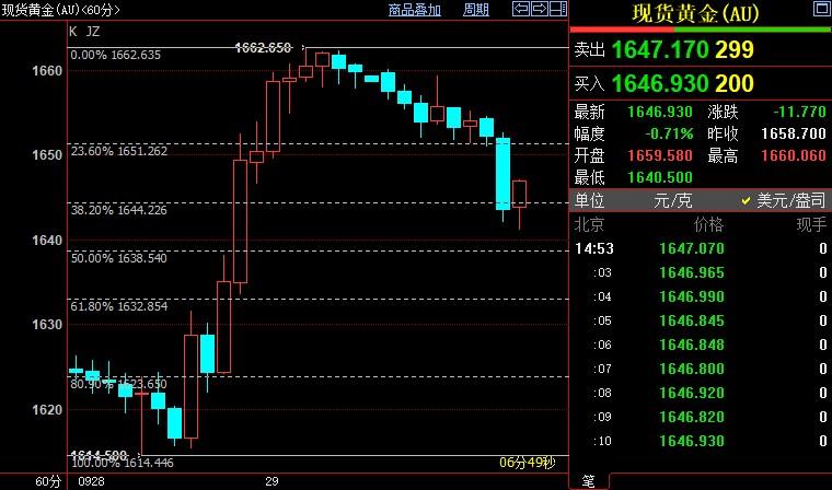 现货黄金下跌0.57%至1650.31美元/盎司;COMEX期金主力合约下跌0.71%至1658.2美元/盎司;