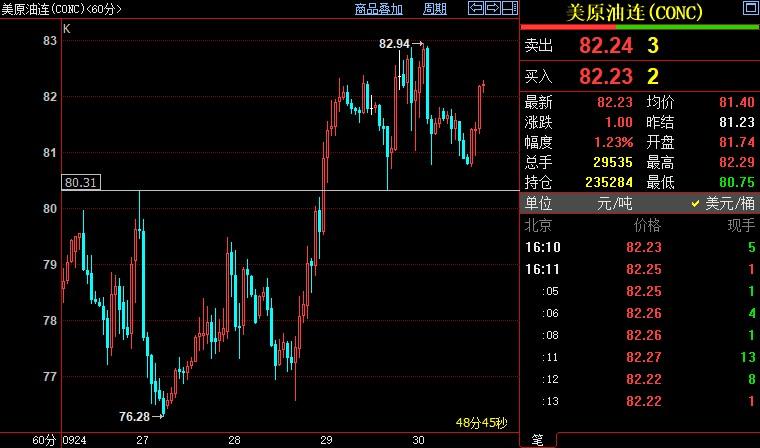 北京时间16:12,NYMEX原油期货上涨1.30%至82.29美元/桶;ICE
