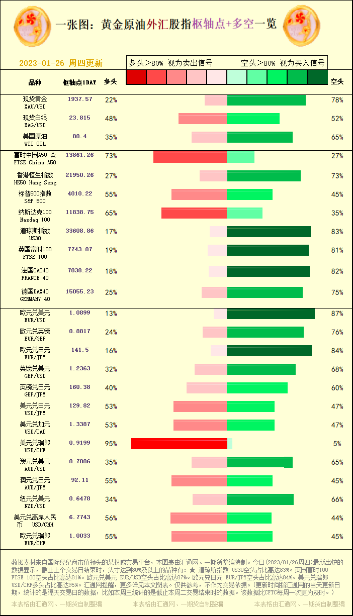 标题:一张图:黄金原油外汇股指"枢纽点+多空占比"一览(2023/01/26周四)