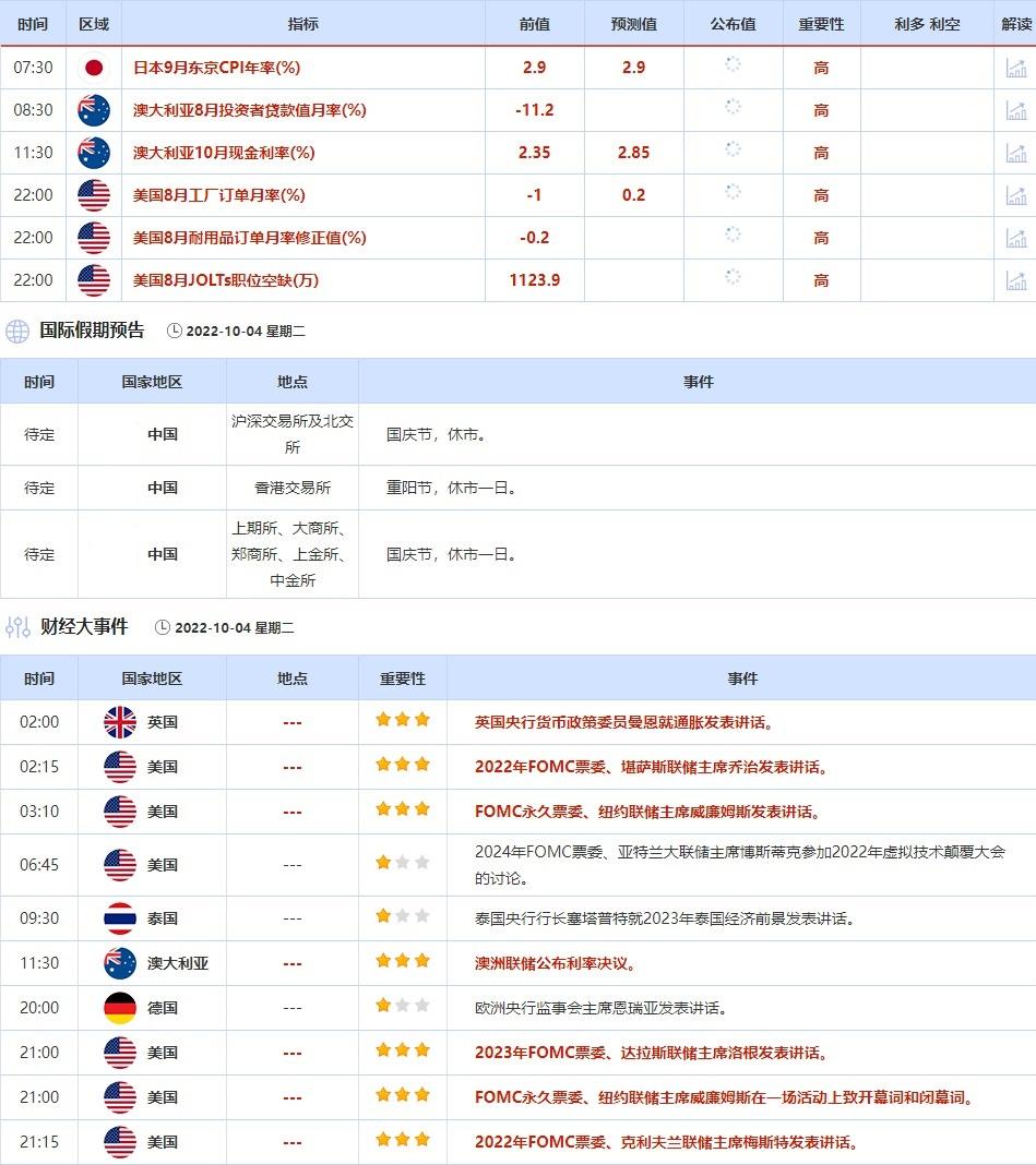 ②10月4日(周二)关键字:日本9月东京CPI,澳洲联储利率决议,达拉斯联储主席洛根,克利夫兰联储主席梅斯特